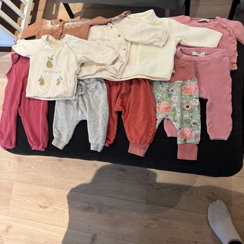 Pakken inneholder klær fra ulike merker som Joha, Name it, Huttelihut med materiale som bomull, ull og bambus. Størrelse varierer fra mellom 56-62.