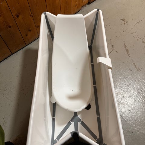 Selger Stokke babybadekar, sammenleggbart i hvit plast med grønne detaljer🌸