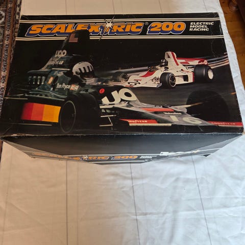 Scalextric X3 Rally Racing bilbanesett med elektrisk racerbane og to rallybiler. Settet inneholder rette og buede banedeler, strømenhet, gjerder og tilbehør for montering av en komplett slotcar-bane. De to bilene er rallybiler i skala tilpasset banen, med detaljerte karosserier og påtrykte startnumre og sponsorlogoer. Egnet som elektrisk bilbane for innendørs bruk.