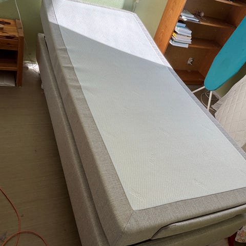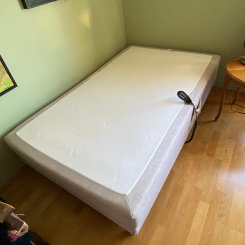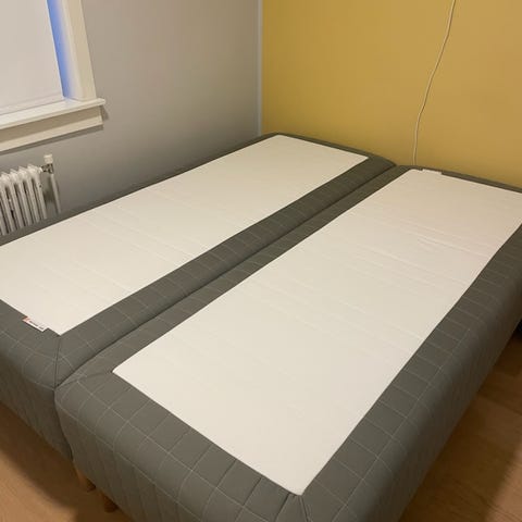 To Skotterud rammemadrasser på 90 cm som kan settes sammen til 180 dobbeltseng, ca 4 år gamle. Velholdte, uten flekker. Tusna overmadrass kan følge med om ønskelig