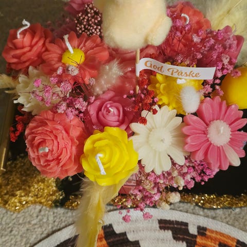 Består av detaljerte blomster i rosa, hvitt og gult, pent innpakket i dekorativt papir. En bukett som holder seg like fin år etter år – helt uten stell.