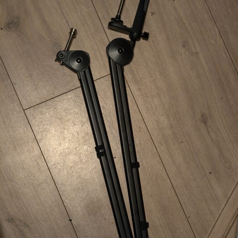 Selger også med den, et Røde mikrofonstativ som er kjøpt separat, med deler for å montere på bordkant.