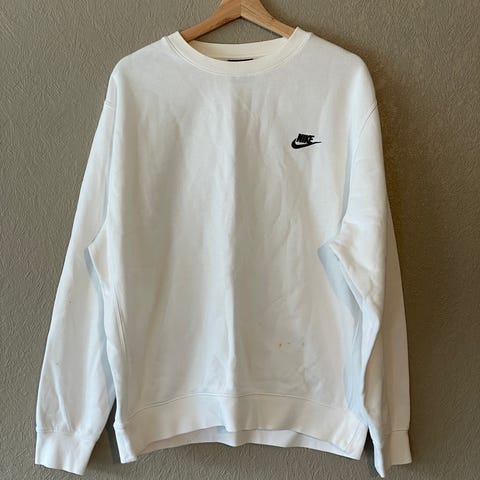 Nike genser for herre i størrelse L. Genseren er hvit og laget i bomull. Klassisk modell med rund hals og ribbestrikkede kanter nederst og på ermene. Lite Nike-logo trykket på brystet. Passer til hverdagsbruk og fritid.