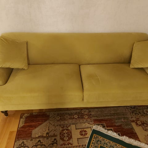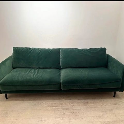 Sofaen er i dyp grønn velur og er myk og