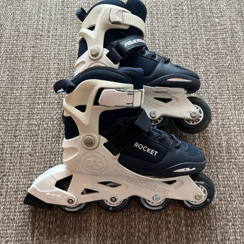 Rulleskøyter/ rollerblades størrelse 28 i svart farge med justerbare spenner og hjuloppsett egnet for bruk på asfalt og andre jevne underlag. Medfølgende beskyttelsesutstyr til albue.