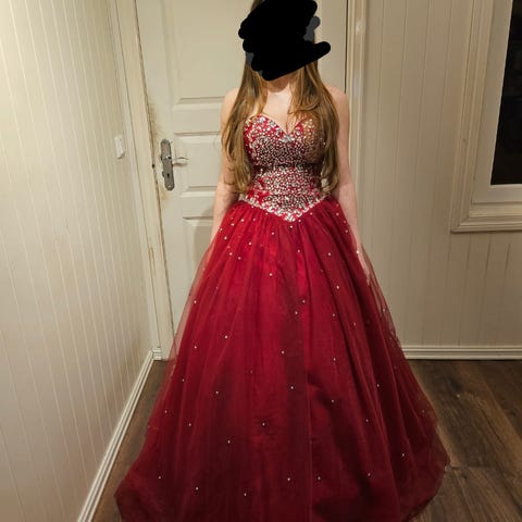 Selger denne ballkjolen. den ble brukt en gang på 10ende klasse ball. min datter er 1.65 høy.
