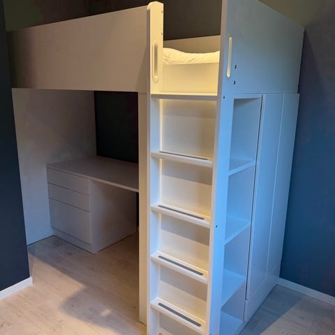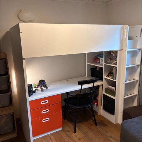 IKEA Småstad loftseng i hvit utførelse. Grå skapdører og skuffer. Ekstra detaljer til håndtak. Sengen er kombinert med et integrert skrivebord med god arbeidsflate og kabelhull, samt en underskuffseksjon med tre skuffer. På siden av sengen er det garderobeskap med dører og hyller, samt trapp med åpne hyller som gir ekstra oppbevaringsplass. Passer til barnerom eller ungdomsrom der man ønsker seng, arbeidsplass og oppbevaring i én løsning. Stol er inkludert.