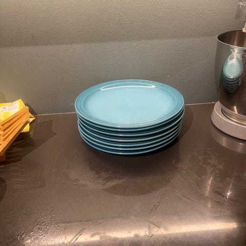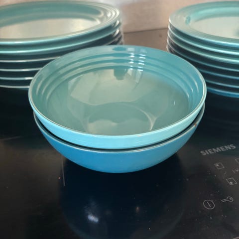 Selger to stilrene serveringsskåler fra Le Creuset i den populære fargen Chambray (en dempet, nydelig blåtone). Skålene er i stentøy av høy kvalitet og har det ikoniske trerings-designet.