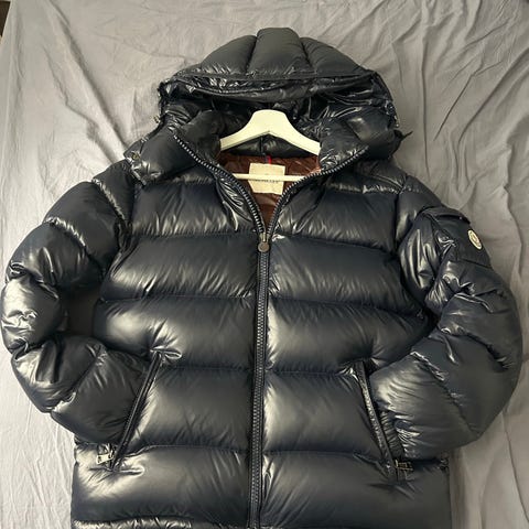 Moncler vinterjakke for herre i størrelse M. Jakken er fylt med dun og har et glansfullt ytterstoff i blå farge. Klassisk vattert design med horisontale kanaler.