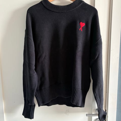 Ami Alexandre Mattiussi genser for herre i størrelse M. Genseren er svart og har et rødt hjerte med bokstaven A på brystet. Laget i bomull, !Følges med tags og pose !