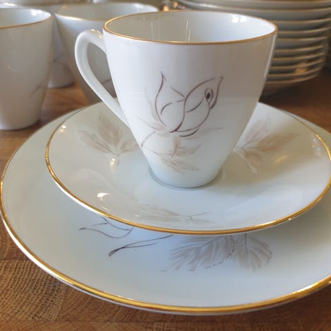 Består av 6 kopper, 6 fat, 6 asjetter og fløtemugge.