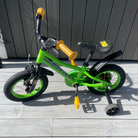 Barnesykkel med 12" hjul, kjøpt på XXL vår 2025! Sykkelen har støttehjul-fester, kjedekasse, skjermer, pedalbremser og justerbart sete. Passer for mindre barn som skal lære å sykle. Vekt på 9 kg,