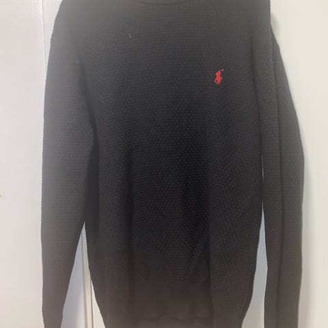 Ralph Lauren genser for herre i størrelse S. Genseren er svart og laget av bomull. Den har kabelstrikket mønster og rund hals. Passer til hverdagsbruk og kan kombineres med både jeans og chinos.