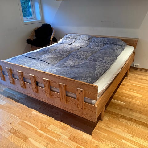Seng med madrass og overmadrass + 2 stk nattbord. Lengde 200 cm, bredde 150 cm.
