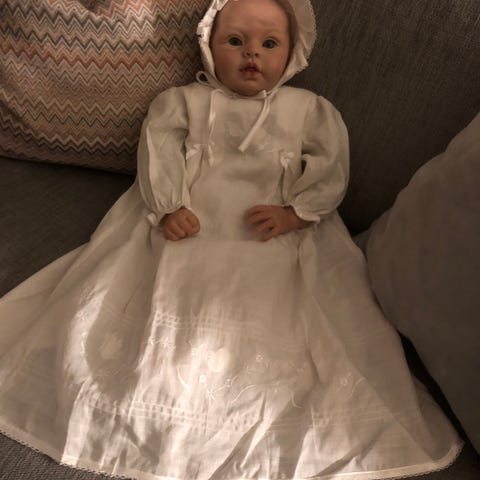 Ekte håndlaget reborn baby selges med håndstrikket baby dåpskjole i hvit farge. Som ny