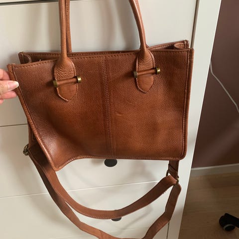 RE DESIGNET by DIXIE skulderveske for dame i brunt lær. Vesken har justerbar skulderrem og lukkes med glidelås på toppen. Innvendig har den flere rom, inkludert glidelåslomme og åpne lommer.
