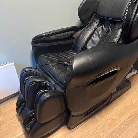 Dette er en fantastisk stol som vi har hatt på jobben. Vi flytter inn i mindre lokaler så vi har ikke plass til den lenger. Den løfter mens den masserer hele kroppen. Vi har vært super fornøyd med den. Usikker på hva vi betalte for den men den er noen år gammel men fungerer perfekt.
