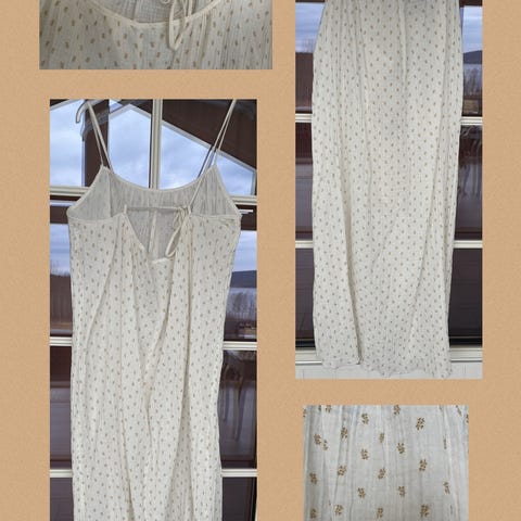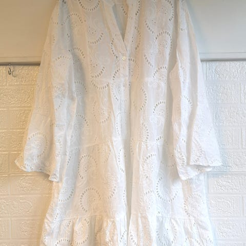 Flott hvit sommerkjole fra Copenhagen Luxe i størrelse M/L, men mest som en L. Kjolen er laget i bomull med broderie anglaise-lignende hullmønster. Trekvartlange ermer.