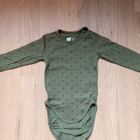 Hummel body for gutt i størrelse 92. Langermet modell i grønn bomull med små mønsterdetaljer. Laget i bomull, ifølge merkelappen organisk bomull. Trykknapper i skrittet for enkel av- og påkledning.
