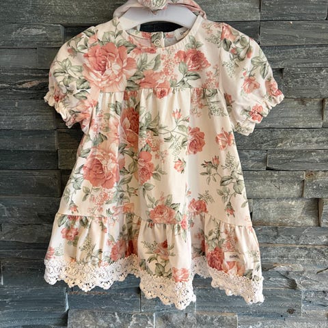 Newbie kjole for barn i størrelse 86. Kjolen er i hvit bomull med blomstrete mønster. Passer til jente. Kortermet modell med rynket skjørt og rund hals. Egnet til hverdagsbruk og enklere penere anledninger.
