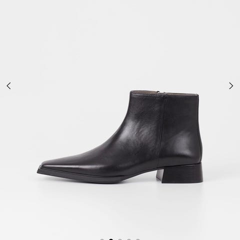 Vagabond ankelstøvler i størrelse 38. Svarte støvler i skinn med spiss tå og middels høy hæl. Elastiske partier i skaftet på sidene for enklere av- og påtaking. Passer til hverdagsbruk og enklere penere antrekk.