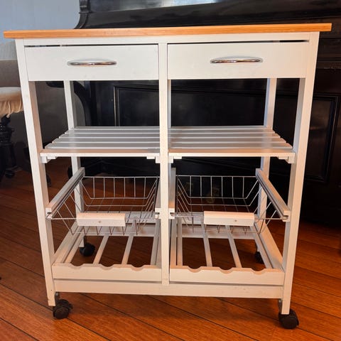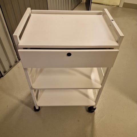 Fint trancherbord med nyttige funksjoner. Skuff, kurv, hylle, plass til flasker. Kroker og annen oppbevaring på sidene.