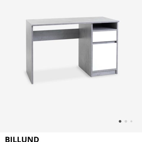 Skrivebord er fra Jysk og heter Kalby. Massiv eik og eikefinér. Soft close-skuff med fullt uttrekk. B60 x L120 x H75 cm. Nypris: 3299kr. Har et lite hakk på siden som går inn mot veggen, så synes ikke (se bilde).