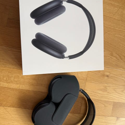 Apple AirPods Max hodetelefoner over-ear i svart farge. Trådløse hodetelefoner med øreklokker som omslutter øret og polstret hodebøyle. Leveres med Smart Case og ladekabel, som vist på bildene. Egnet til bruk med kompatible Apple-enheter via Bluetooth for lytting til musikk, film og annet lydinnhold.