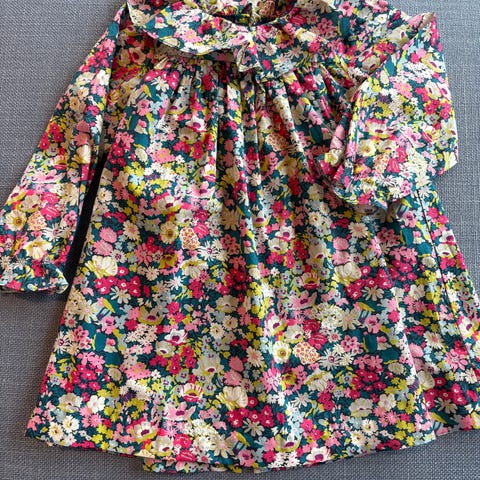 Primark kjole for jente i størrelse 98. Kjolen er laget av bomull og har et flerfarget blomstermønster. Modellen har lange ermer, rysjedetaljer foran og markert liv med utsvingt skjørt. Passer til hverdagsbruk eller enklere penbruk.
