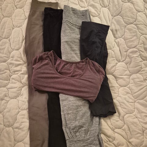 Komfortable leggings til graviditet. Lappen med materiale er borte, men er i treningsklær materiale (polyester?). Den ene er fra HM, den andre ukjent. Prisen er for begge 2 samlet.