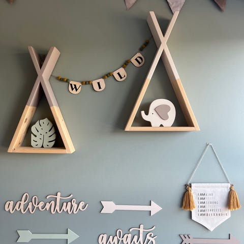 HM home vegghylle i hvit farge med skyformet design. Hyllen er beregnet for montering på vegg og egner seg for oppbevaring eller utstilling av lette gjenstander på barnerom eller andre rom. Utførelsen er i et glatt, malt materiale med festehull for skruer på siden mot veggen. Passer til innredning av barnerom eller lekeområde der man ønsker en enkel og dekorativ oppbevaringsløsning.