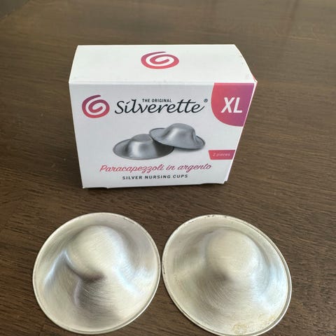 Silverette ammeskjold i ekte sølv, størrelse XL. Kan ikke få rost disse nok, de reddet ammestarten vår.