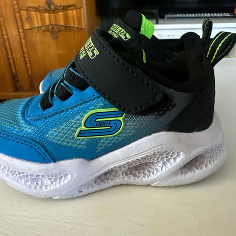 Skechers joggesko / blinkeski for gutt i størrelse 21. Skoene er i blå og svart med detaljer i blant annet grønt og hvitt. Overdelen er i tekstil og syntetisk materiale med borrelåsrem og elastiske lisser for enkel av- og påtaking. Yttersålen er kraftig og mønstret for godt grep.