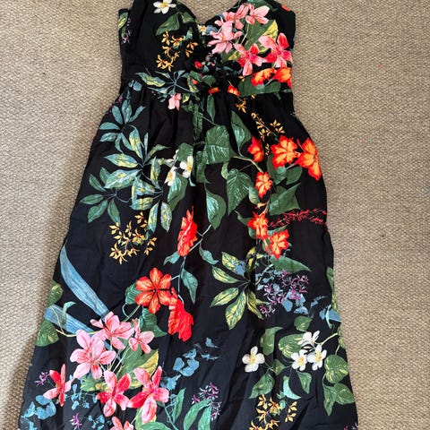Hell Bunny kjole for dame i størrelse S. Kjolen har flerfarget pinup- og blomstermønster med damemotiver. Overdelen er figurnær med bredt skulderparti og markert liv, mens skjørtet er utsvingt i A-fasong. Tykt og slitesterkt materiale. Disse tenker man ikke over på avstand, men veldig kult når man kommer nærme og kan se hva det faktisk er.