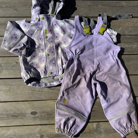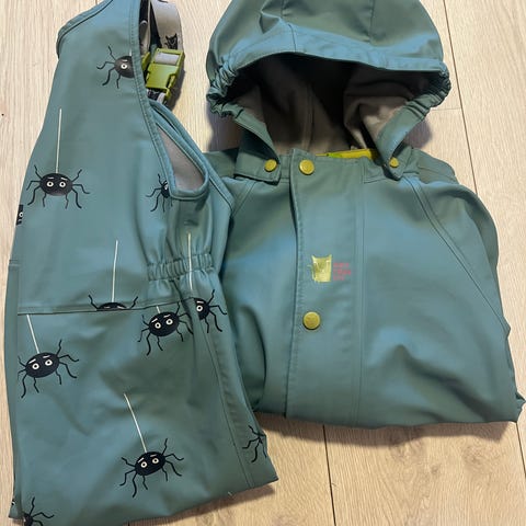 Kattnakken regntøy størrelse 86. Sett med jakke og selebukse. Pent brukt, men noen bruksmerker forekommer. Ingen hull. Strikk på begge bein. Kun skylt uten såpe i vaskemaskin
