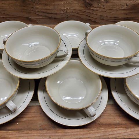Selger samlet 6 stk kopper med en hank på hver side fra Porsgrunn Porselen. Fine å bruke til feks suppe, buljong eller kakao. Gullkant øverst langs kanten og øverst på begge hankene. Etter stempelet under å dømme, ser det ut til at de kan være produsert i 1954. Mål: 5 cm høye og med diameter på 12,5 cm.