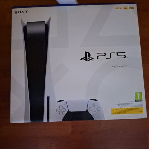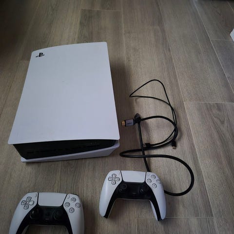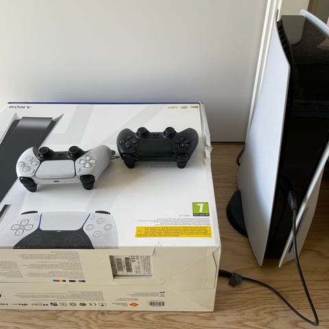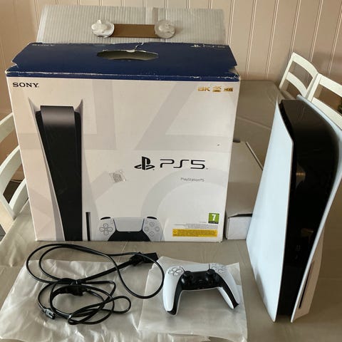 Sony Playstation 5 spillkonsoll. Konsollen leveres med flere trådløse DualSense-kontrollere i ulike farger, strømkabel og tilkoblingskabler. I tillegg følger det med fysiske spill på disk til Playstation 5 og Playstation 4, slik som vist på bildene. Egnet for bruk hjemme til TV- eller skjermtilkobling for spilling alene eller sammen med andre.