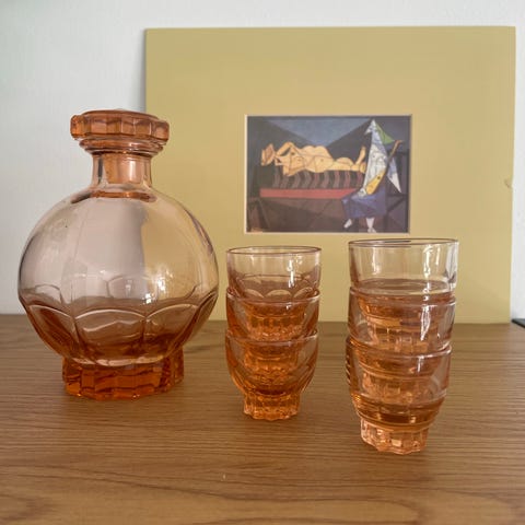 De er med liljekonvall-mønster, så trolig tysk design. Men jeg har også sett Hadeland glassverk ha noe som ser likt ut.