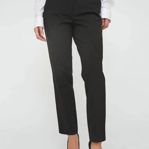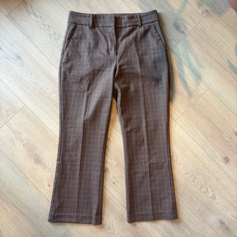Elegant dressbukse med klassisk passform. Medium høyt liv med bred linning som lukkes med hemper og glidelås. Rett modell med litt flare i bena, stikklommer i sidene og jukselommer bak.