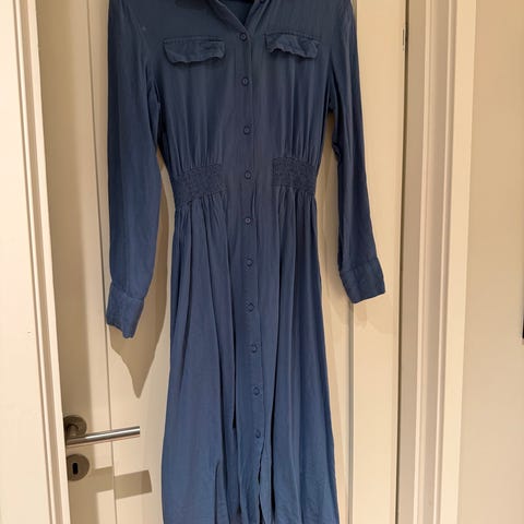 Moss Copenhagen hverdagskjole i størrelse M. Kjolen er i finfin blå farge og faller pent på. Modellen har lange ermer, knapper foran og strikk i midjen. Skjørtet rekker omtrent til leggen, avhengig av høyde. Passer som hverdagskjole til bruk både på jobb og fritid.