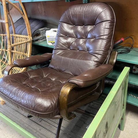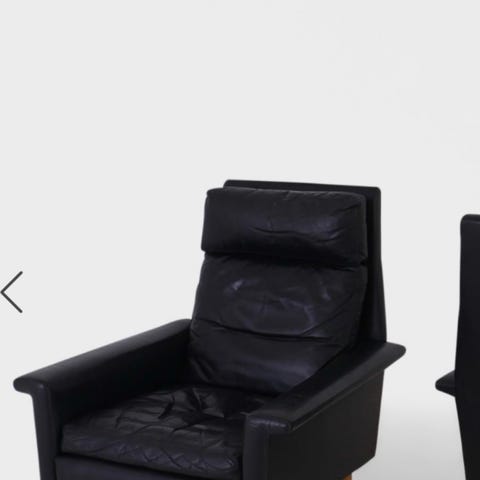 To vintage loungestoler i siinn med fotskamler selges samlet på grunn av plassmangel. Muligens Afdal. Skamlene er noe slitt og mangler et par knapper.