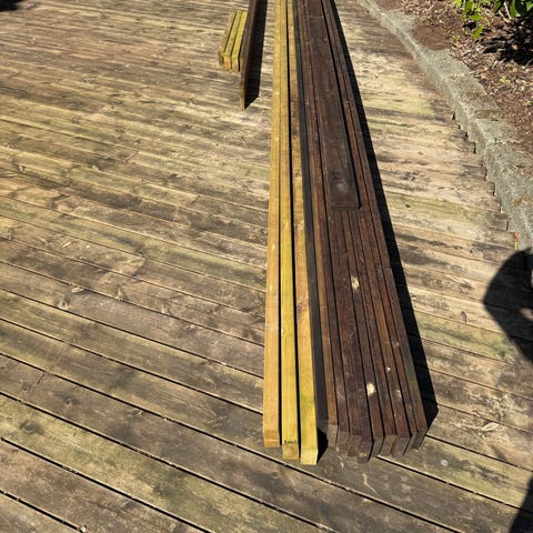 Jeg gir bort ulike typer plank i forskjellige dimensjoner og lengder, hovedsakelig bord og lekter. Noen av bordene er behandlet eller beiset i ulike bruntoner, andre er ubehandlet eller grånet. Noe er rester fra tidligere terrasse.