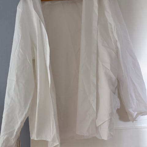 Hvit bluse for dame i størrelse M. Modellen har lange ermer og krage, og lukkes foran med knapper evt. knytes. Den er kort - går til typ midje. Blusen har løs passform og noe lengre frontparti som kan knytes eller henge løst, samt rynkedetaljer bak.