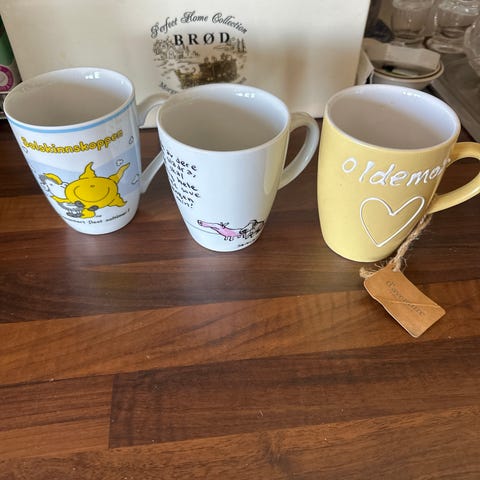 Selger mine fine englekopper da de aldri blir brukt. De ligger i esken de hadde da de ble kjøpt og alle har duskene sine hengende på fortsatt. Har brukt fire av de og tre av de har fått litt misfarging. Har ikke prøvd å fjerne de. De er ikke kjørt i oppvaskmaskinen. Den ene koppen har også skalet bitte lite dessverre.