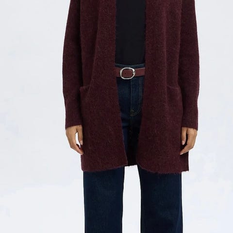 OBJECT cardigan i ull for dame i størrelse L. Lang modell i beige farge med ribbestrikkede detaljer foran og nederst. Cardiganen har lange ermer, åpen front og to lommer foran. Leveres med matchende beige trekantskjerf med flerfargede dusker langs kanten. Passer som ytterlag over topper, kjoler eller gensere i kjøligere vær. 50% ull og 50% acrylic