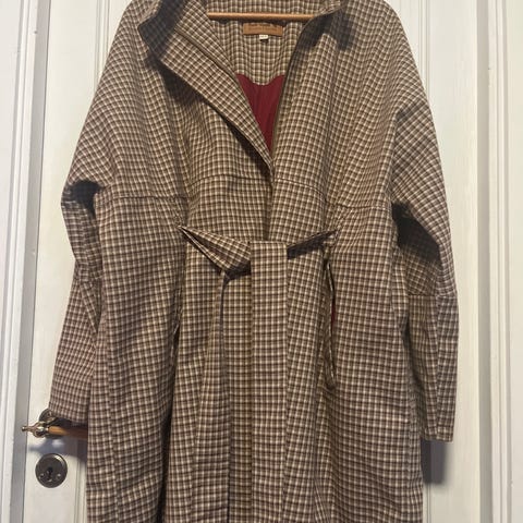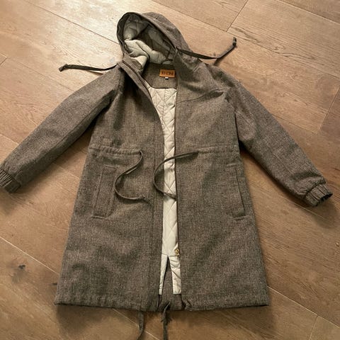 BRGN ytterjakke for dame i størrelse M. Jakken er grå og laget i denim-materiale. Den har hette, belte i livet og er helfôret på innsiden. Passer som yttertøy i overgangssesonger og på kjølige dager.