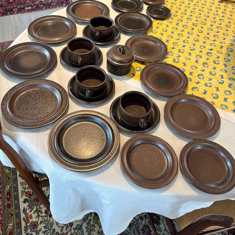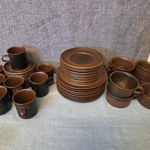 Arabia Ruska servise i rustikk brunt steingods, med sjatteringer fra mørk brunsort til lysere nyanser.