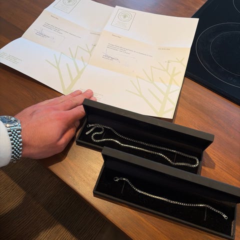 Stål kjede med Bergens gult gull mynt , med 1 ledd i gull og logo, 45 cm langt
