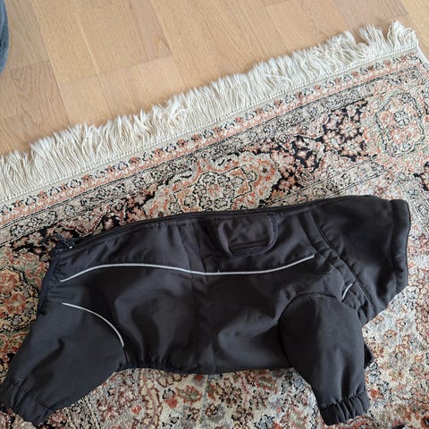 Dressen har åpning til sele på ryggen. Utformet som en heldekkende dress for hund, egnet for kjøligere vær og turer utendørs.