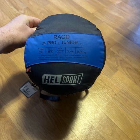 Ubrukt Haglöfs Pavo sovepose 110 cm i blå farge og gul innside.